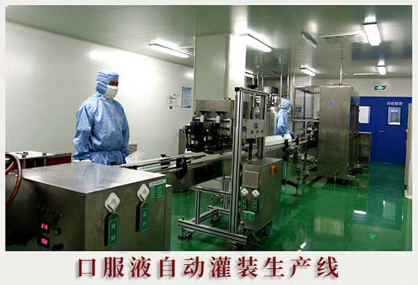 口服液产品在十万级洁净区生产,采用自动空气净化系统,对生产线尘粒、压差、风速进行监控,保证生产环境的高度清洁。口服液的生产从称量到装箱引进多功能灌装机、自动搓盖机、电磁封口机、多功能贴标机、打包机等设备,实现了生产线的完全自动化,生产线能适应不同规格的方瓶、圆瓶、异形瓶,能适用50-5000ML的装量灌装要求。灌装机采用脉冲控制活塞定量方式,灌装精度高,调节智能简便,生产效率高。车间年产量600万瓶以上,为动物保健提供优质高效的口服液产品,产品远销亚洲、非洲、欧洲、美洲等几十个国家。